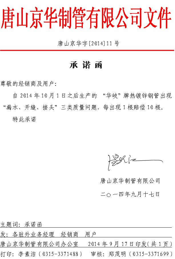 承诺函 唐山京华字【2014】11号