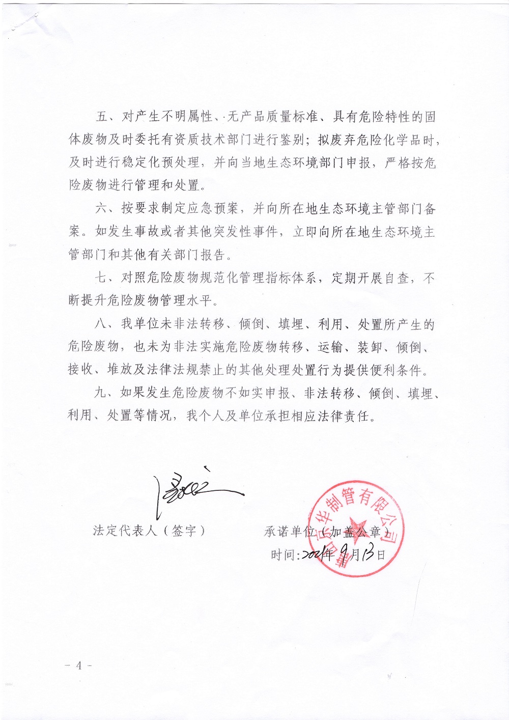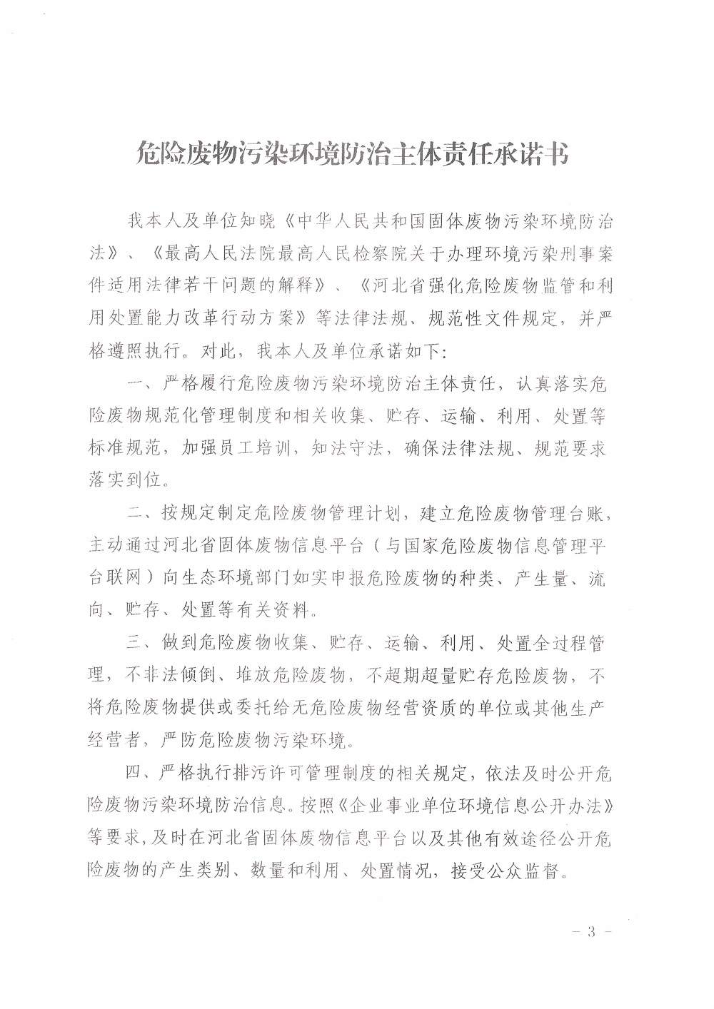 唐山京华危险废物污染环境防治主体责任承诺书