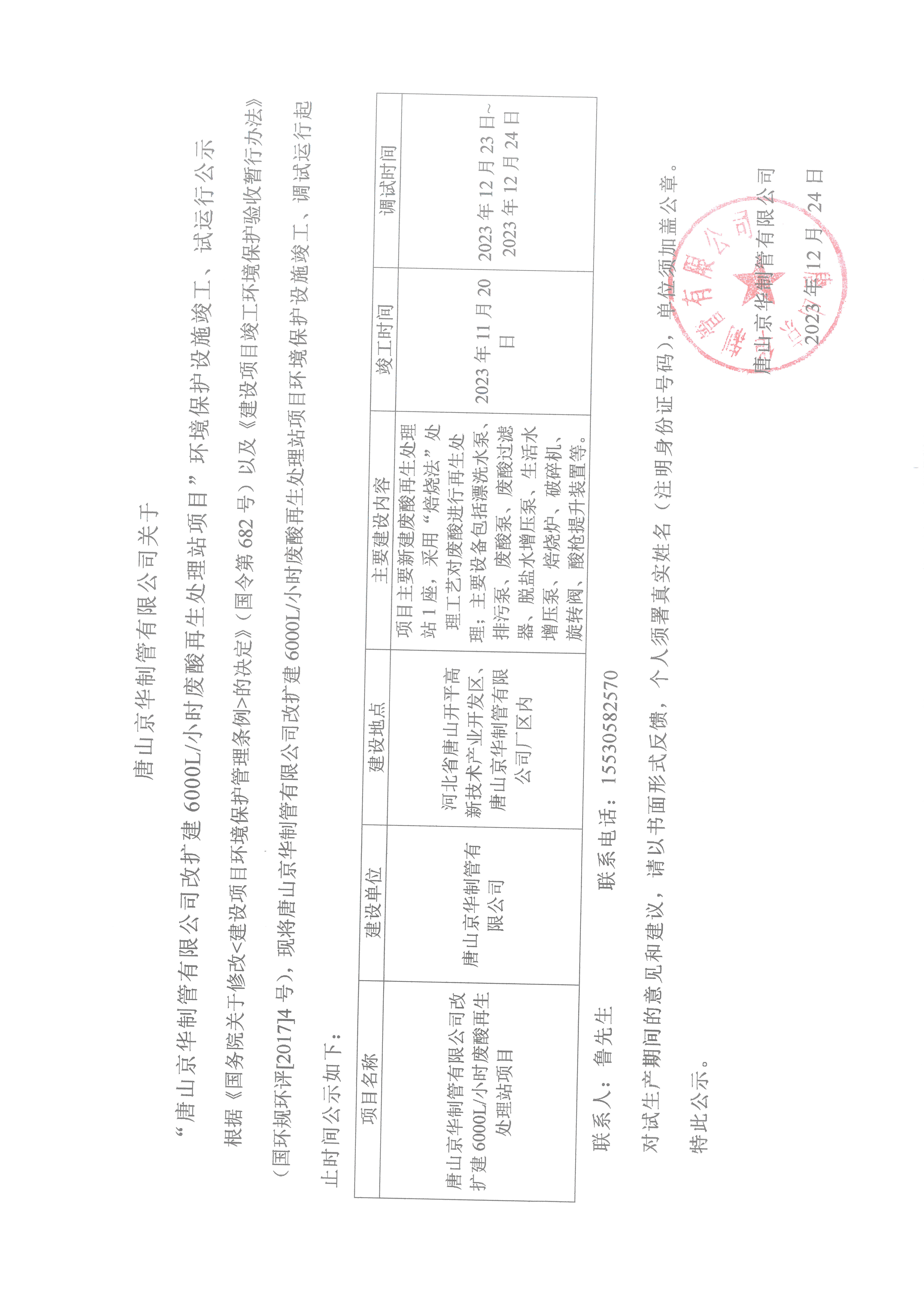 华体会体育平台官方网站-华体会(中国) 关于“华体会体育平台官方网站-华体会(中国) 改扩建6000L每小时废酸再生处理站项目”环境保护设施竣工、试运行公示